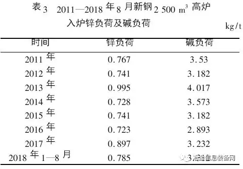 2013 年,新鋼2 500 m3 高爐入爐鋅負荷、堿負荷分別高達0. 995 kg /t 和4. 017 kg /t( 見表3) ,遠遠高于國標要求。高爐90% 以上的鋅負荷和60% 左右的堿金屬負荷來自燒結(jié)礦,這也是爐料結(jié)構(gòu)中高比例燒結(jié)礦給高爐生產(chǎn)帶來的新問題,同時也是近年來新鋼兩座2 500 m3 高爐有不同程度結(jié)厚的重要原因。近年來新鋼2 500 m3 入爐鋅負荷、堿負荷情況見表3。