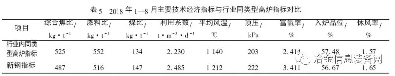 2018 年1—8 月新鋼2 500 m3 高爐主要技術(shù)經(jīng)濟指標與行業(yè)內(nèi)同類型高爐指標對比見表5。
