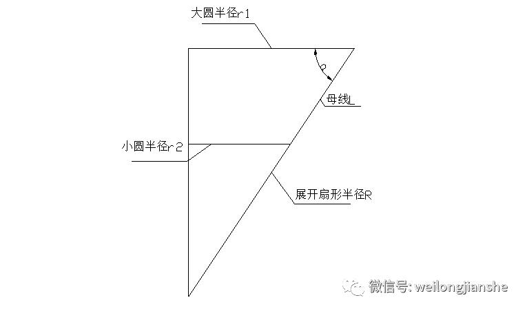 ② 爐殼如果是圓柱體只要知道圓柱體的高和底圓周長***能求出展開長方形的長和寬,這里不予以詳細介紹,主要說一下錐臺展開,首先要找到圖紙給出的大圓半徑r1和小圓半徑r2還有母線長L,如下圖: